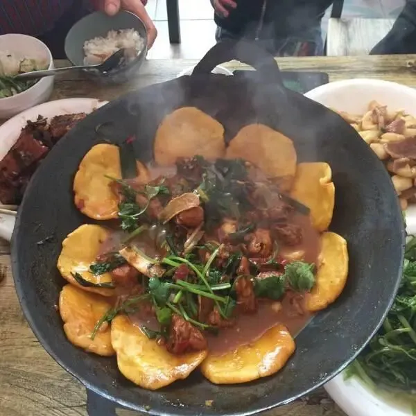 地锅鸡,主要流行江苏省徐州市、安徽省宿州市、淮北市、枣庄市和山东省济宁市等地区。地锅菜的汤汁较少,口味鲜醇,饼借菜味,菜借饼香,具有软滑与干香并存的特点。地锅鸡起源于苏北和鲁南交界处的微山湖地区,因渔家人每天忙于捕鱼捉虾,无暇做一道道繁琐菜肴,就以面菜合炖做出的一道农家菜,不料却炖出了徐州一绝,流传市井经久不衰,在徐州人尽情享受舌尖上的美味同时,财如春雨滚滚来,也给徐州带来了可观的经济效益和知名度。