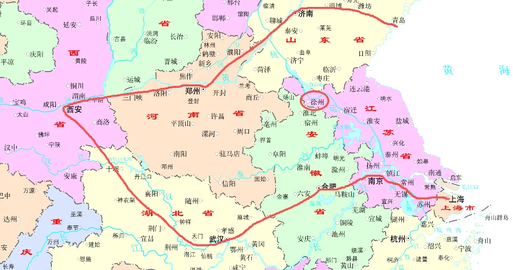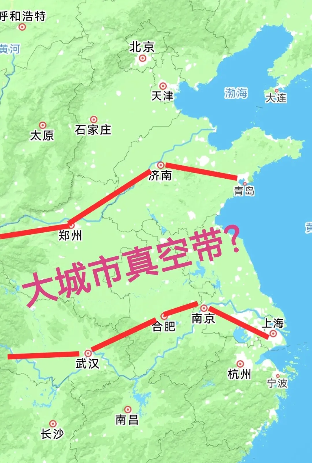 南边是上海-苏无常-南京-合肥-武汉这一条线;北边是青岛-济南-郑州-西安这一条线,这两条线上都是大城市,两条线之间的淮河流域广大地区,0省会城市、0万亿GDP城市。