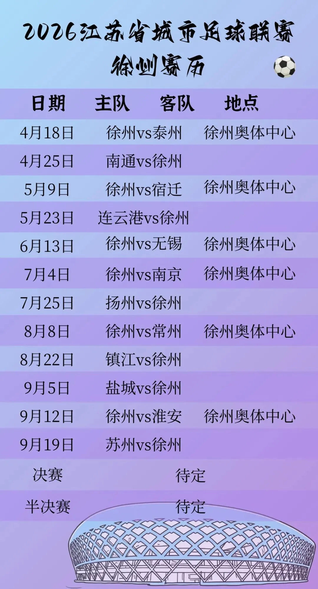 2026年江苏省城市足球联赛常规赛将于4月11日拉开战幕,徐州已定12场比赛。徐州奥体中心作为徐州队主场,将迎来6场硬核对决。