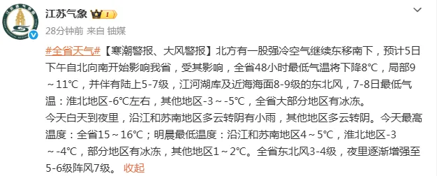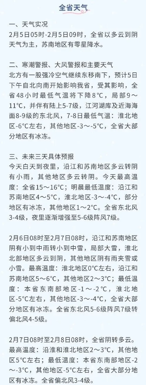 今天白天到夜里多云转阴,早晨部分地区有雾,东北风5级阵风6到7级,气温1℃到16℃。6日阴,有时有小雪,东北风5级阵风6到7级,气温-4℃到2℃,有冰冻。【寒潮警报、大风警报】北方有一股强冷空气继续东移南下,预计5日下午自北向南开始影响我省,受其影响,全省48小时最低气温将下降8℃,局部9~11℃,并伴有陆上5-7级,江河湖库及近海海面8-9级的东北风,7-8日最低气温:淮北地区-6℃左右,其他地区-3~-5℃,全省大部分地区有冰冻。