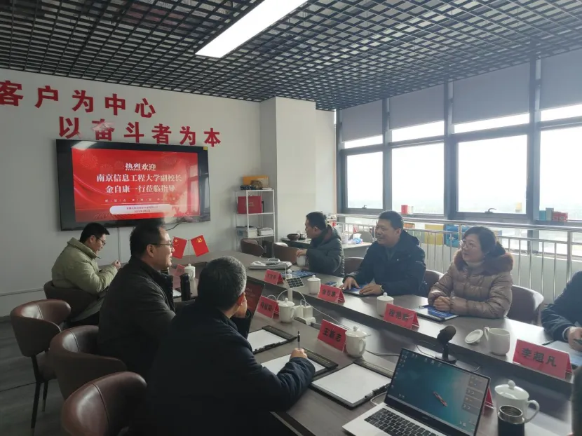 柯福阳首先对金自康一行的到来表示热烈欢迎。他表示科博公司源于南京信息工程大学,公司的发展壮大离不开学校和领导的信任、关心与支持,对此表示衷心感谢。他介绍了科博公司的发展历程、现状及科产教融合实践发展经验,阐述了科博公司未来在人才培养、校企联合研发、政校企合作等方面与学校深度合作的愿景。他表示,科博将始终紧密依托南信大学科优势,期待在学校的进一步关心支持下,推进与学校在教育、科技、人才、产业“四位一体”的全面深度合作,优势互补、资源共享,深化科产教融合与协同创新创业,未来科博将在南信大设立科创基金,共同推动科技创新创业、成果转化与产业化。