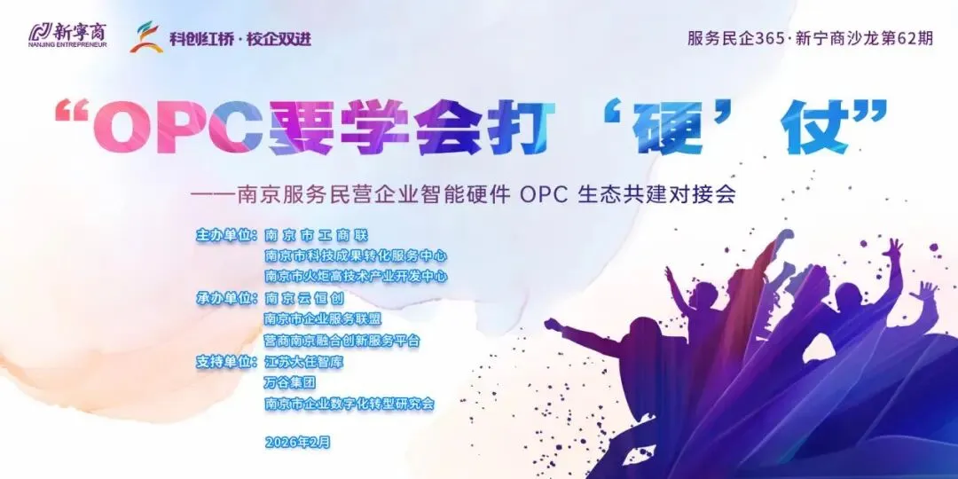 当江苏省“单人成军”的 OPC 创新理念席卷而来,“人工智能+”的浪潮正为创业江湖注入全新活力。为填补南京智能硬件OPC 创业生态短板,让新质生产力在 OPC 赛道加速萌发,为硬科技创业者搭台赋能,2 月 4 日,“OPC 要学会打‘硬’仗”—— 南京智能硬件 OPC 生态共建对接会在熊猫·万谷金融科技中心成功举办。万谷集团全程鼎力支持这场聚焦硬科技创业的盛会,见证政府、高校、企业协同发力,为智能硬件创业者解决难题、对接资源。