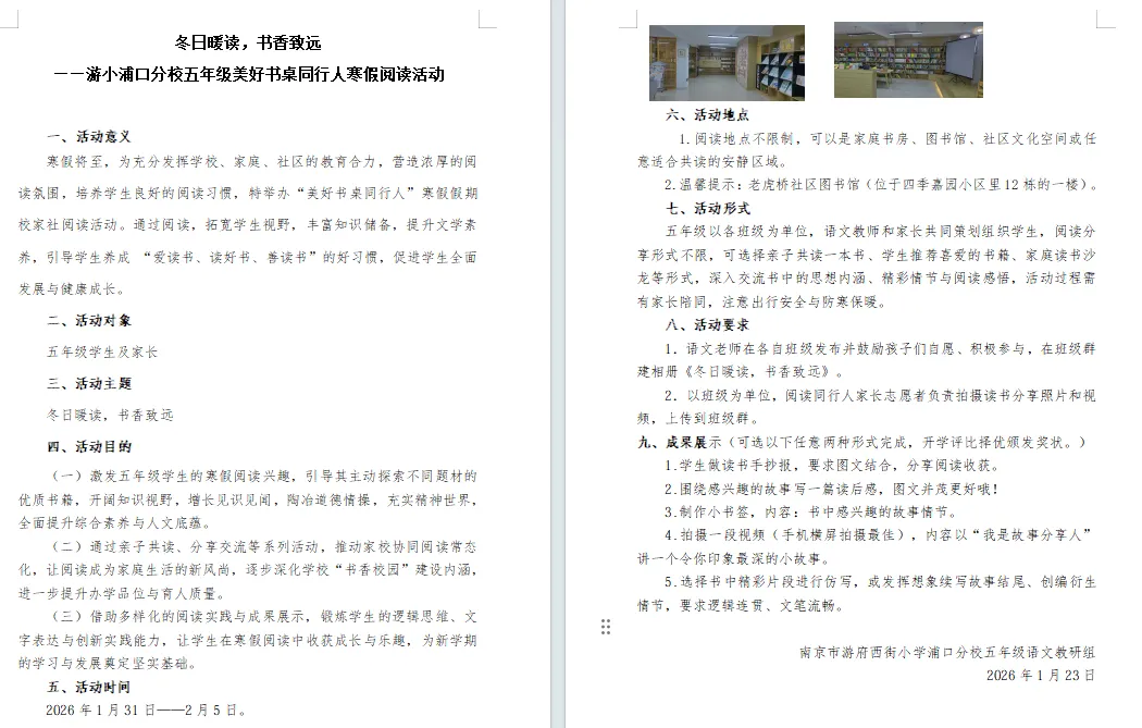 为厚植学生阅读根基,构建家校社协同育人的阅读生态,让阅读成为伴随孩子一生的好习惯,南京市游府西街小学浦口分校五年级语文备课组精心策划了“冬日暖读,书香致远”寒假阅读活动,为同学们的假期生活增添了一抹浓郁的书香底色。
