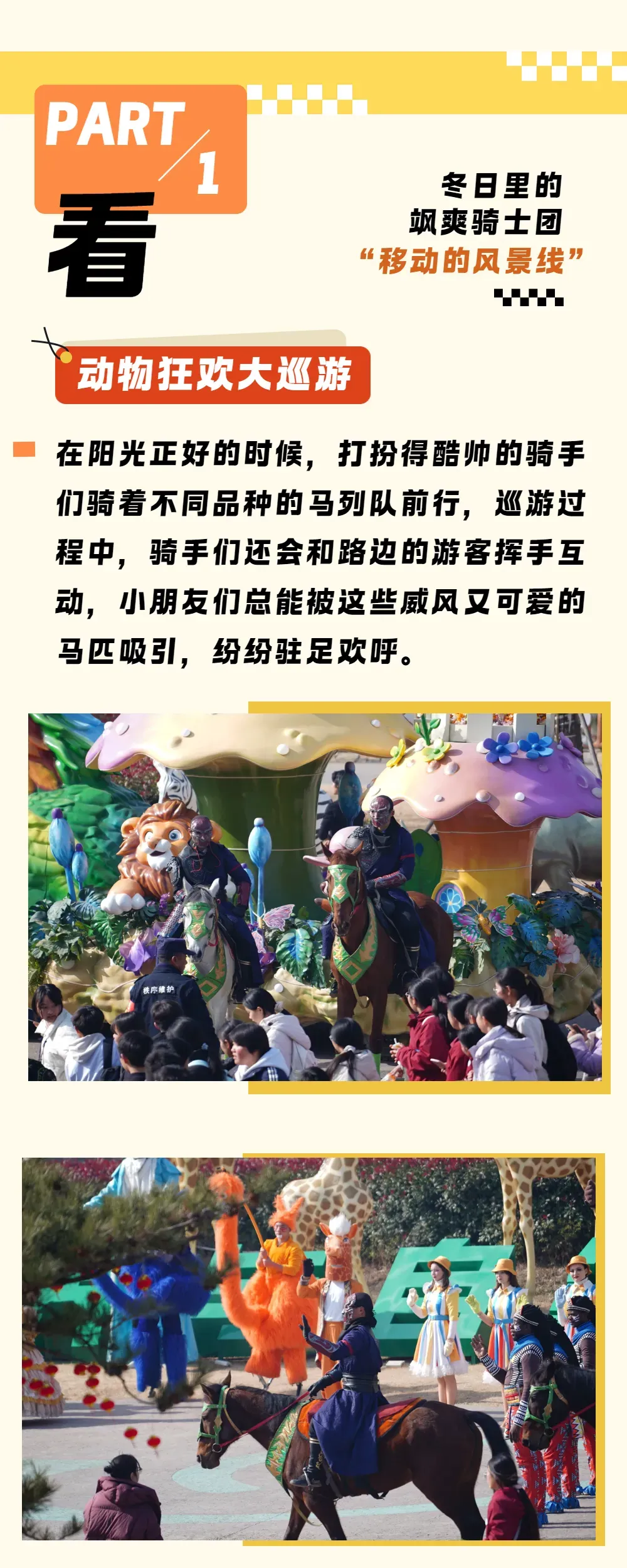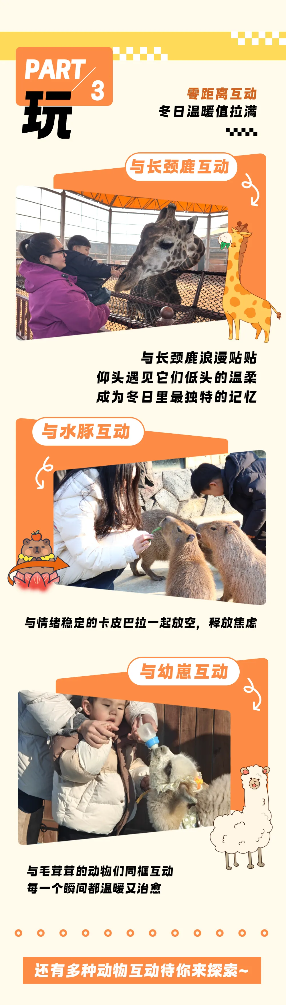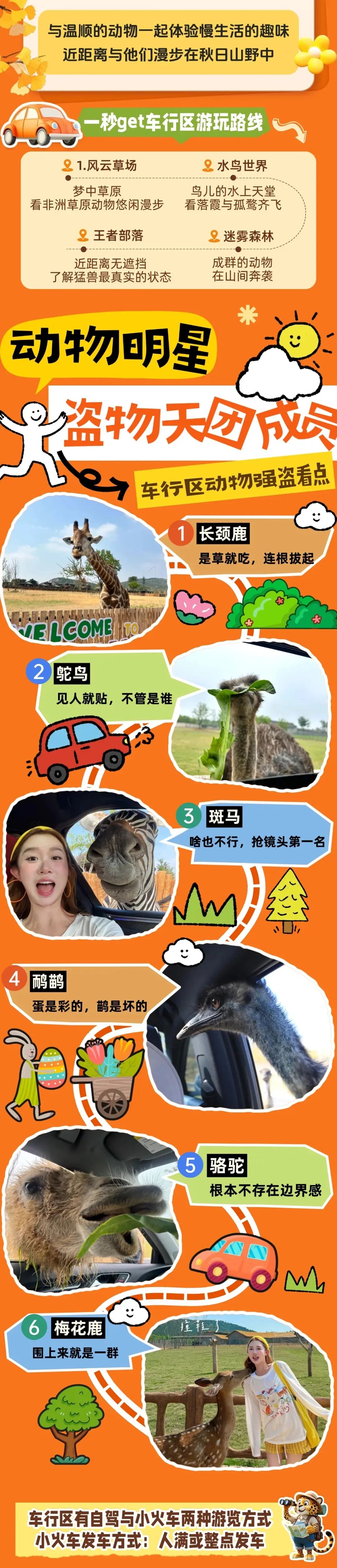 园区内有占地1300余亩的车行区域,游客可乘坐园区小火车(自理10元/人),多视角、沉浸式与野生动物近距离接触。这一区域共分四个组团:以非洲动物展示为主的“风云草场”,以水禽、游禽、涉禽展示为主的“水鸟世界”,以欧亚非草食动物综合展示的“迷雾森林”,以猛兽展示为主的“王 者部落”。车行区野生动物采用生态散养模式,停车于途中,便有温顺的动物将头伸入车窗与游客亲密接触。
