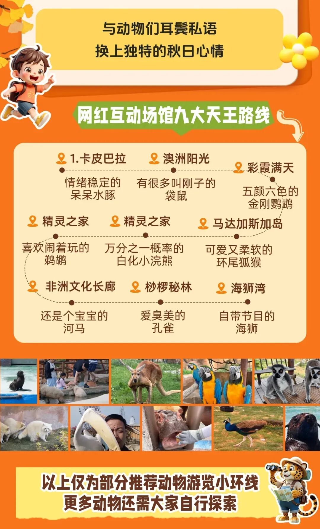 船行区分为四大展区,有以河马、大羚羊、美洲红鹮等动物展示的“雨林觅踪”,以丹顶鹤、白枕鹤、黑天鹅等动物展示的“密西西秘林”,以驼羊、蓑羽鹤、粉红背鹈鹕、火烈鸟等动物展示的“列岛奇缘”,还有以恐龙造型为空间结构主体,结合VR全息投影技术,打造虚拟史前动物空间和现实飞禽走兽交相呼应的“奇洞掠影”。