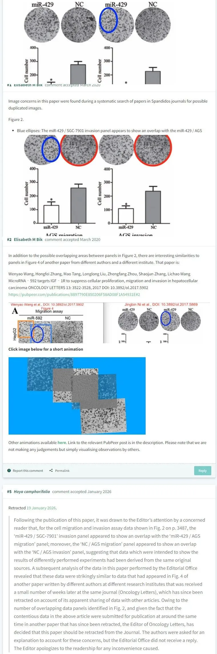 值得注意的是,Elisabeth M Bik 进一步发现,该论文图 2呈现的实验数据与在《Oncology Letters》同期发表的肝癌研究论文Wenyao Wang等作者,研究肝癌的 “MicroRNA-592 targets IGF-1R to suppress cellular proliferation, migration and invasion in hepatocellular carcinoma”,DOI: 10.3892/ol.2017.5902)图 4 数据存在有趣相似性,而两篇论文作者来自不同单位,研究方向也不同(一篇胃癌、一篇肝癌)。同期,另一网友 Hoya camphorifolia 也以 “cookie-cutter” 间接指出了数据可能存在的模板化复制问题。
