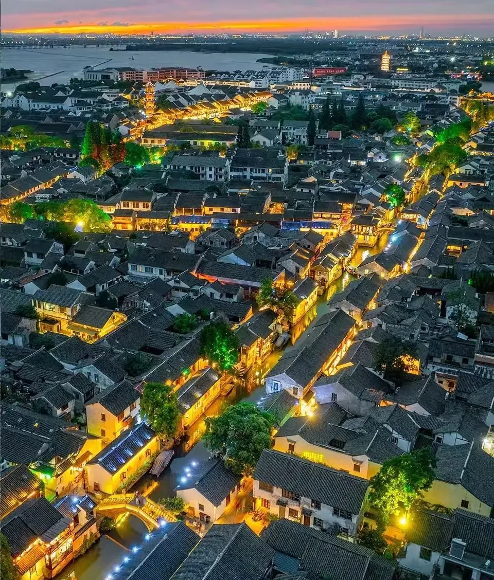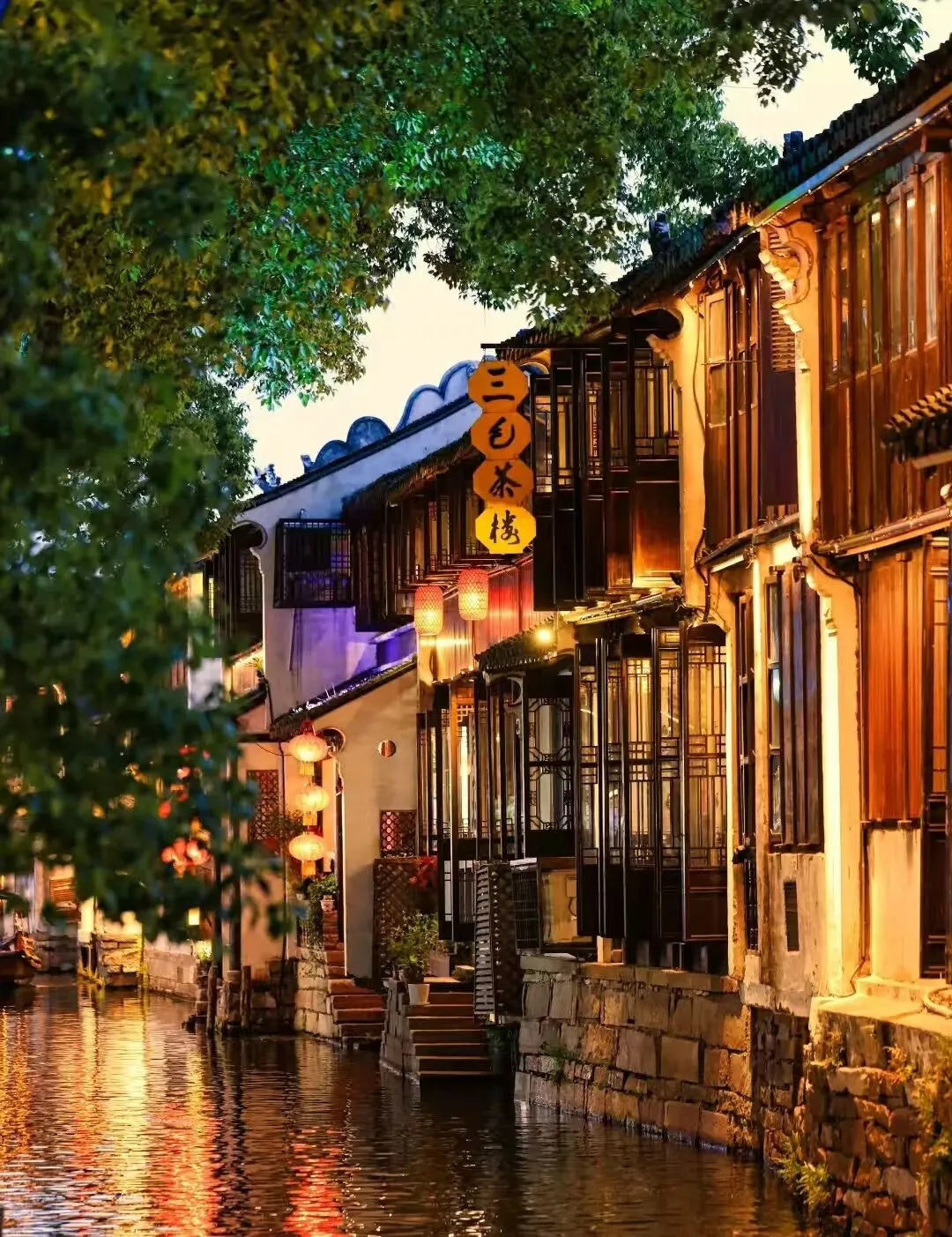 暮色垂落,周庄的灯笼次第亮起,柔光在石板路上流淌,橹声轻摇,水影碎成星子,古镇在夜色中舒展如一幅水墨长卷。