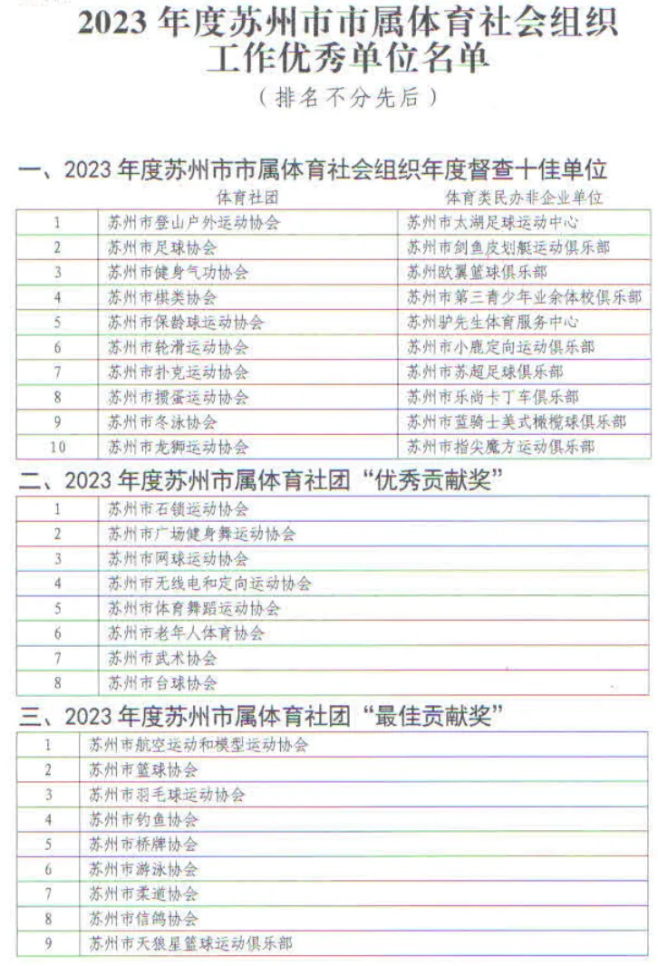 为进一步弘扬正气、树立标杆,激励苏州市体育社会组织奋发进取、创先争优,苏州市体育总会根据2023年度市属体育社会组织全年工作和重点工作督查情况,对苏州市太湖足球运动中心等20家“年度督查十佳单位”、苏州市网球运动协会等8家年度工作“优秀贡献奖”单位,苏州市篮球协会等9家“最佳贡献奖”单位进行了表彰。