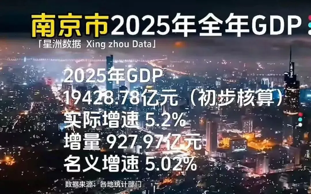 2025年南京GDP 19428.78亿,实际增速5.2%,名义增速5.02%,这个增速很不错。作为曾经的长江五虎之一,南京守住了GDP第十名的位置,并将与身后宁波的差距从300多亿拉大到了700多亿。