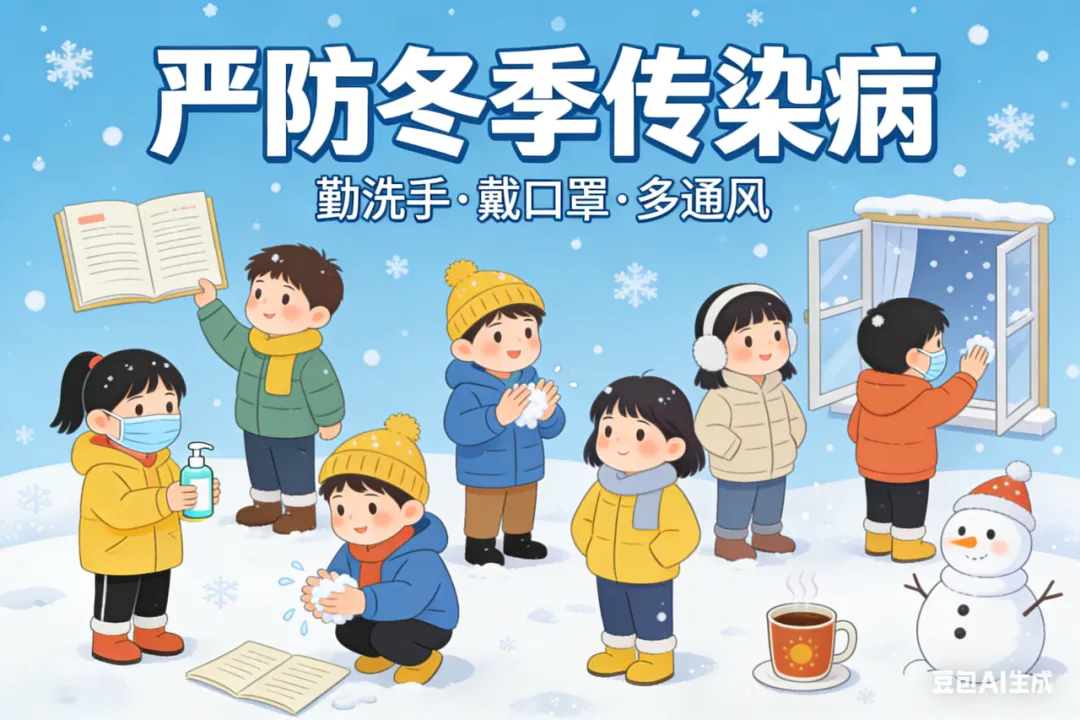 冬季呼吸道传染病多发,且寒假春运期间人员流动和聚集性活动增多,请家长和孩子做好传染病预防工作。引导孩子均衡膳食,多饮水,规律作息,适度运动,增强免疫力