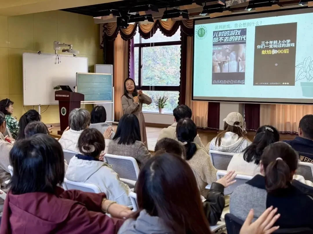 11月20日,栖霞风行讲师陈蕾园长开展《游戏童年点亮未来》家庭教育讲座。她以手指游戏开场唤醒家长童年记忆,阐释游戏是幼儿认识世界的本能方式及多元发展价值,建议家长支持幼儿户外自然游戏、控制电子媒介接触,现场家长写下亲子游戏计划,携手共筑孩子游戏成长之路。