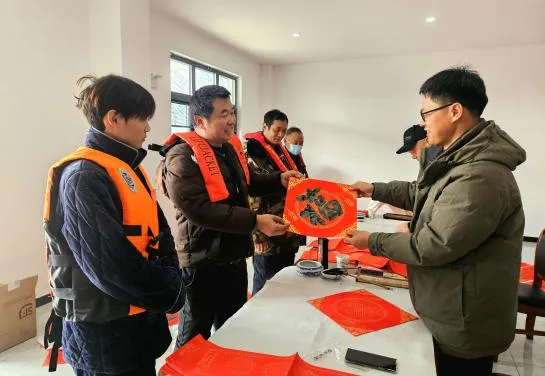 活动现场,由江苏交通文联书法家书写的“门啓微山湖迎春送暖情无限 闸通运河水载福纳祥意满舟”春联揭幕,喜庆春联映照着运河波光,成为蔺家坝船闸最亮眼的新春标识,彰显徐州港航护航水运江苏高质量发展、谱写“水运江苏·美丽港航”新画卷的坚定决心。书法家代表为待闸船员挥毫泼墨,书写个性化春联、福字及平安符,邀请船员共同参与,增强船员文化认同与归属感。船员们手持春联、福字合影留念,定格幸福瞬间,让春运更具温度与年味。