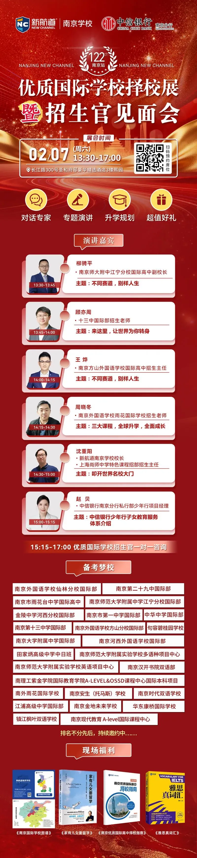 为了帮助南京的家庭破解择校难题,新航道南京学校联合中信银行,特别策划举办“优质国际学校择校展暨招生官见面会”。这不仅仅是一场展会,更是一次难得的、高效的择校决策机会。