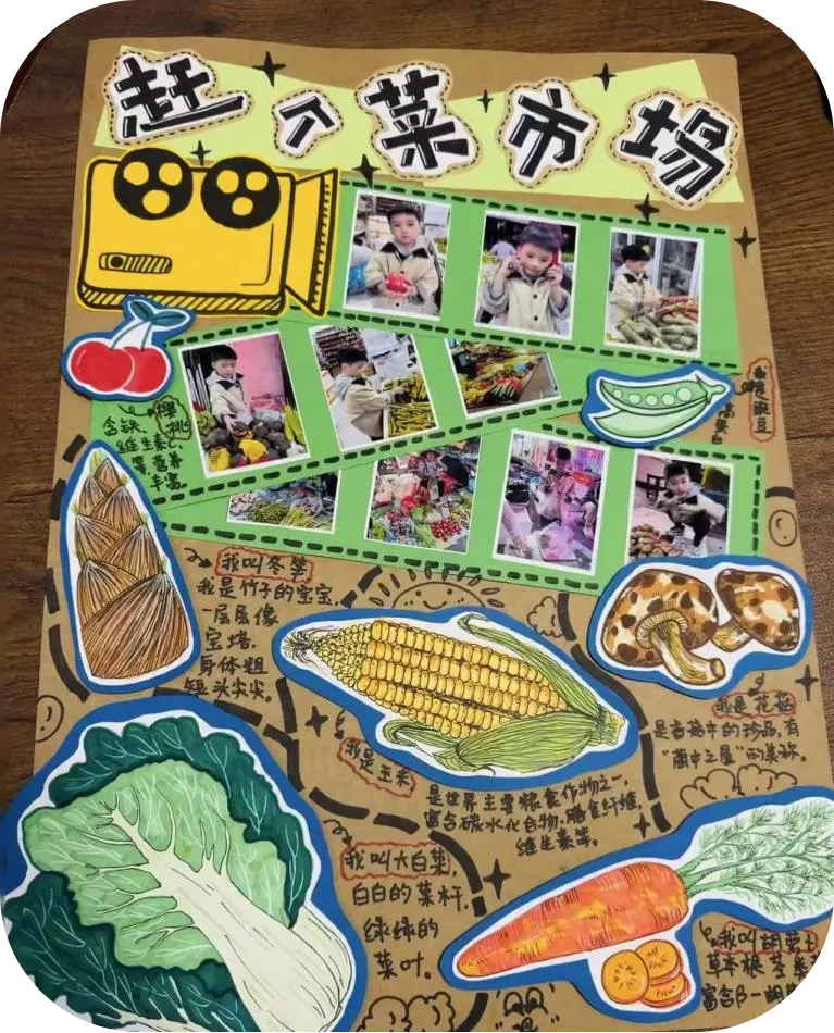 和爸爸妈妈一起去一次菜市场或超市。请你找到三种不同颜色的蔬菜,并观察人们是怎样挑选、购买食物的。请爸爸妈妈帮你拍下你和“色彩蔬菜”的合影,制作一张简单的《我的寻菜日记》照片拼贴画。