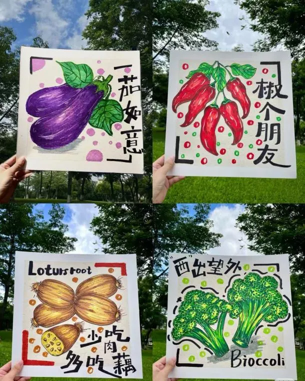 从购买的蔬菜中,挑选一位你最喜欢的“朋友”。摸摸它、闻闻它,为它画一张独一无二的肖像画,并给它起个有趣的名字,完成一幅A4大小的创意绘画《这是我的朋友____》。