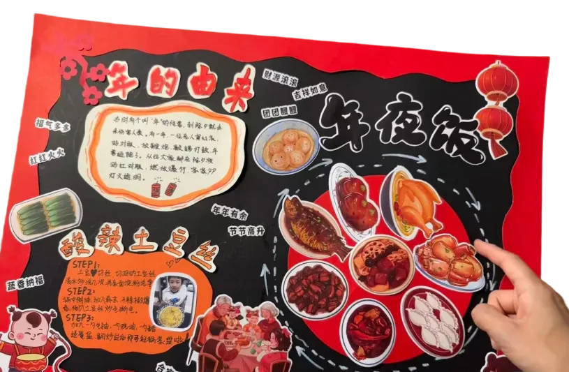 用相机或画笔,记录下你家丰盛的年夜饭全景。尝试向家人了解一道菜的特别故事或在家长指导下,学会并独立完成一道拿手菜(如西红柿炒蛋、凉拌菜)。提交一份图文并茂的《我的拿手菜谱》,并附上菜品成品照或完成一幅年夜饭全景图(照片或绘画),并附上一道菜的“故事简介”。