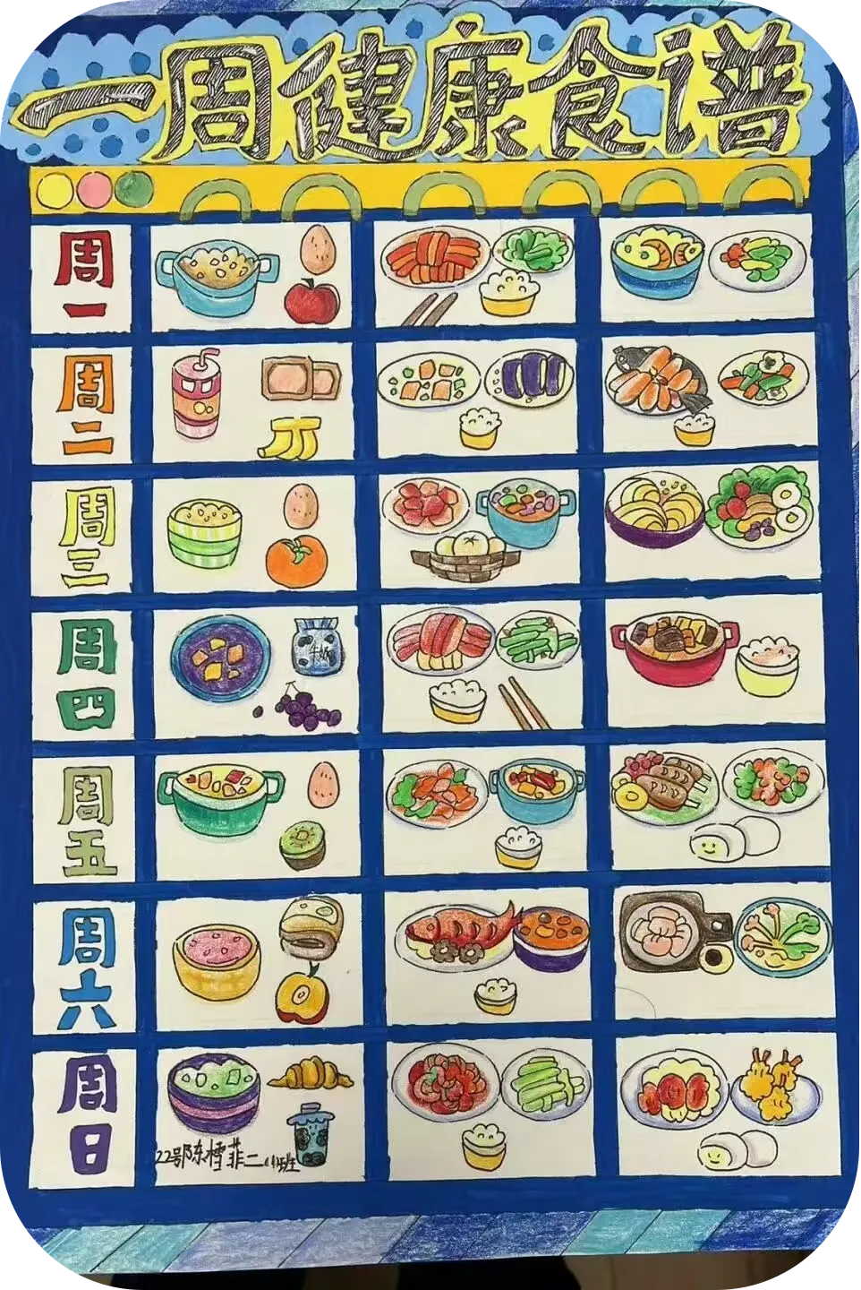 请你运用膳食宝塔知识,为你的家庭设计一份“周一至周日”的健康饮食计划建议表。完成一份设计精美、搭配合理的《家庭一周健康饮食计划表》。