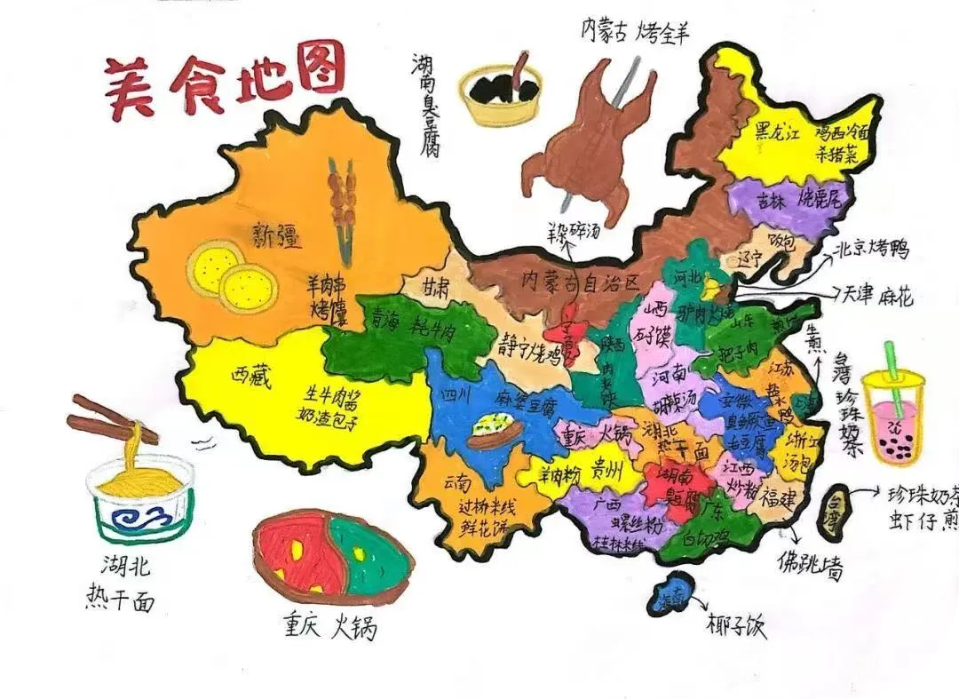 中国幅员辽阔,为什么不同地方的人们爱吃的东西截然不同?请你在中国地图上,标记出搜寻全国各地标志性美食及其文化内涵。绘制一幅有详细注解的《中国美食人文地图》。