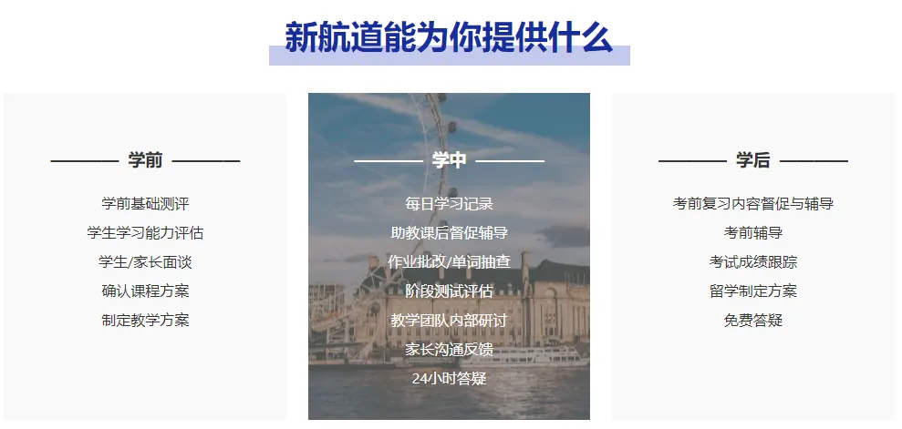 通过 “课程指导+英语提升+择校规划”三大核心服务,由经验丰富的教师与规划团队全程护航,帮助学生夯实学术基础、明确升学路径。