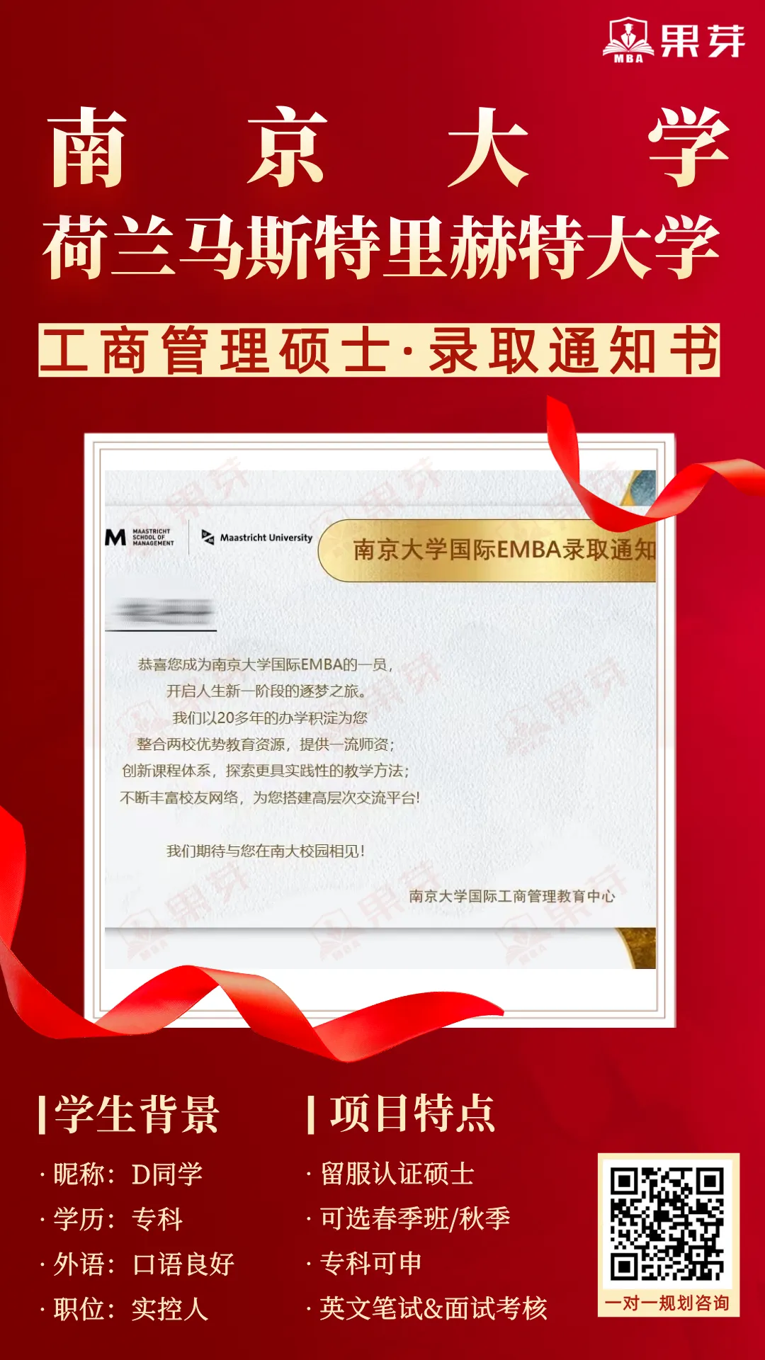 南京大学国际EMBA是由南京大学(NJU)与荷兰马斯特里赫特大学(UM)合作举办的工商管理硕士学位教育项目,获得中国教育部正式批准开办(批准书编号为:MOE32NL1A200006560)。
