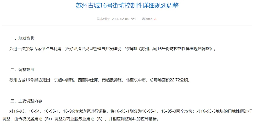 苏州古城16号街坊范围:东起中街路、西至学仕河、南起景德路、北至东中市,总用地面积22.72公顷。