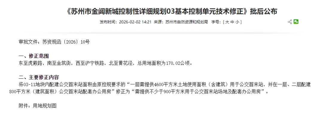将03-11地块内配建公交首末站面积由原控规要求的“一层需提供4600平方米土地使用面积(含建筑)用于公交首末站,并在一层、二层配建800平方米(建筑面积)公交首末站配套办公用房”修正为“需提供不少于900平方米用于公交首末站场地及配套办公用房”。