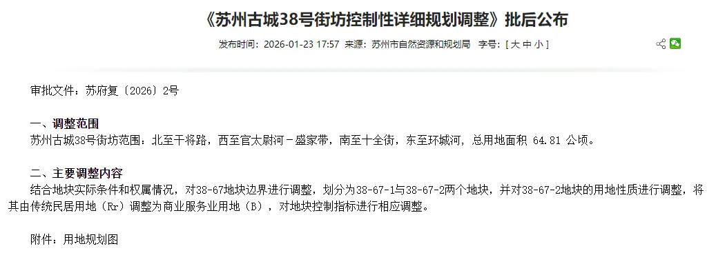 苏州古城38号街坊范围:北至干将路,西至官太尉河-盛家带,南至十全街,东至环城河, 总用地面积 64.81 公顷。