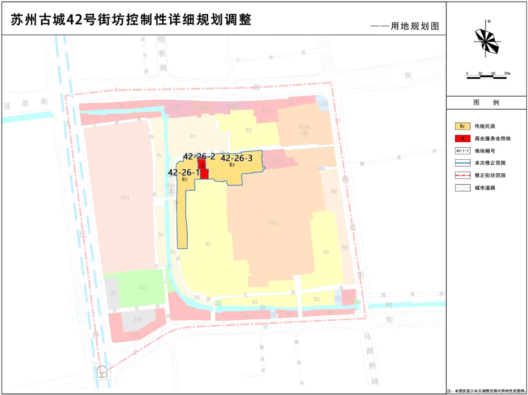 结合地块实际条件和权属情况,对42-26地块边界进行调整,划分为42-26-1、42-26-2与42-26-3三个地块,并对42-26-2地块的用地性质进行调整,将其由传统民居用地(Rr)调整为商业服务业用地(B),对地块控制指标进行相应调整。