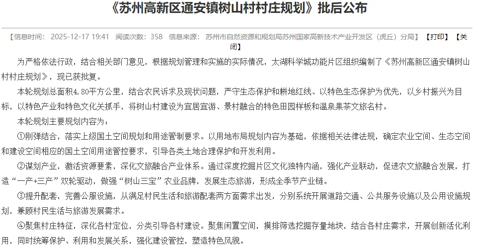 太湖科学城功能片区组织编制了《苏州高新区通安镇树山村村庄规划》,现已获批复。