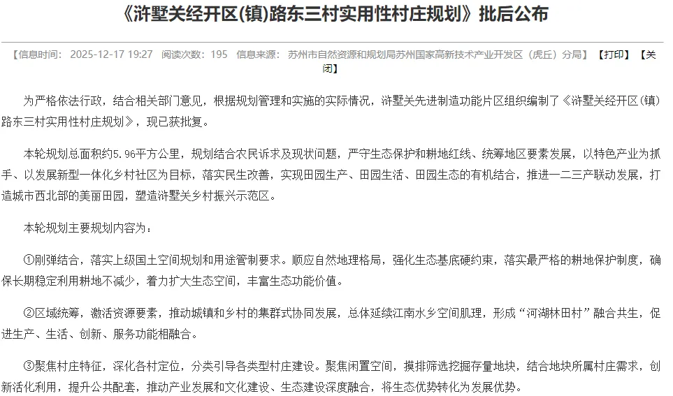 浒墅关先进制造功能片区组织编制了《浒墅关经开区(镇)路东三村实用性村庄规划》,现已获批复。