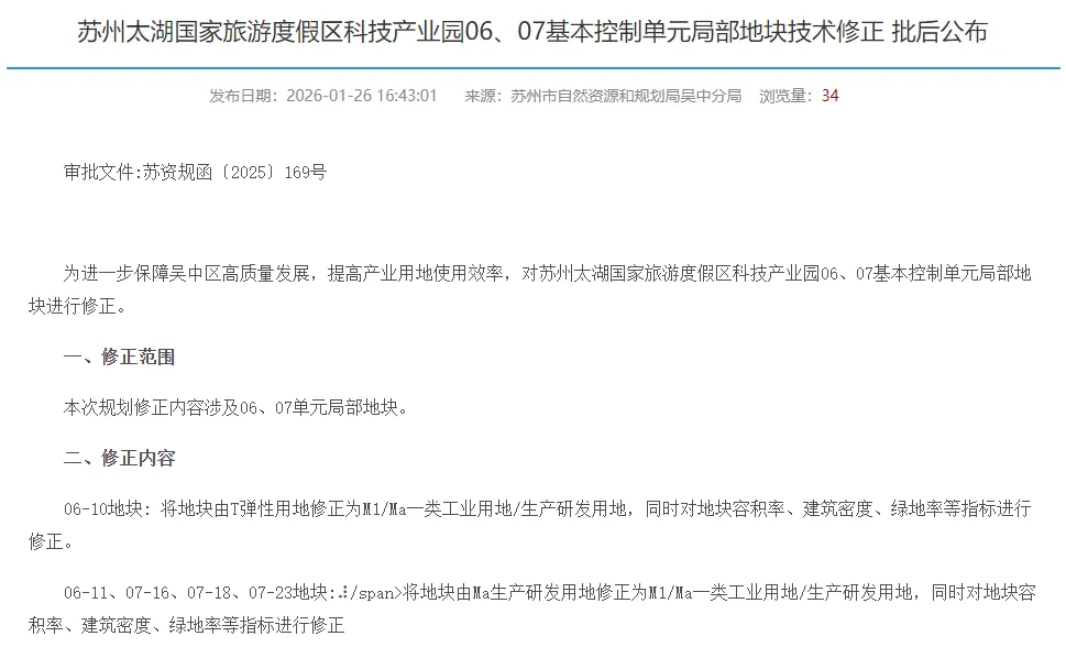 06-10地块:将地块由T弹性用地修正为M1/Ma一类工业用地/生产研发用地,同时对地块容积率、建筑密度、绿地率等指标进行修正。