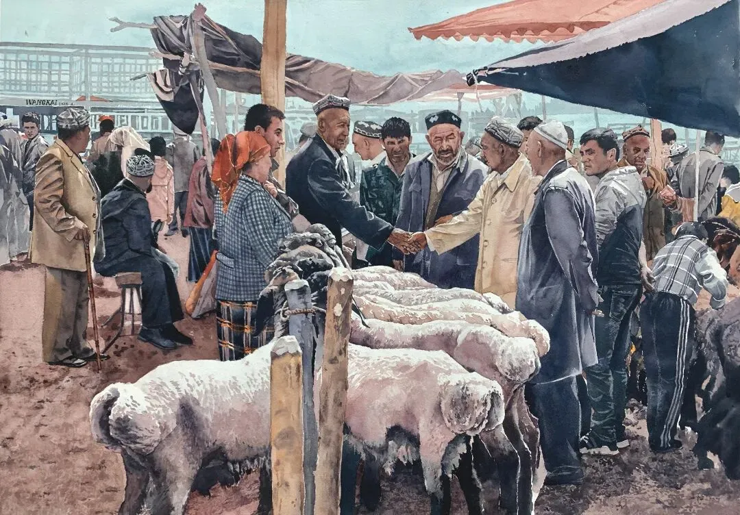 王楷《阿达西的巴扎.看中了几只羊》纸本水彩