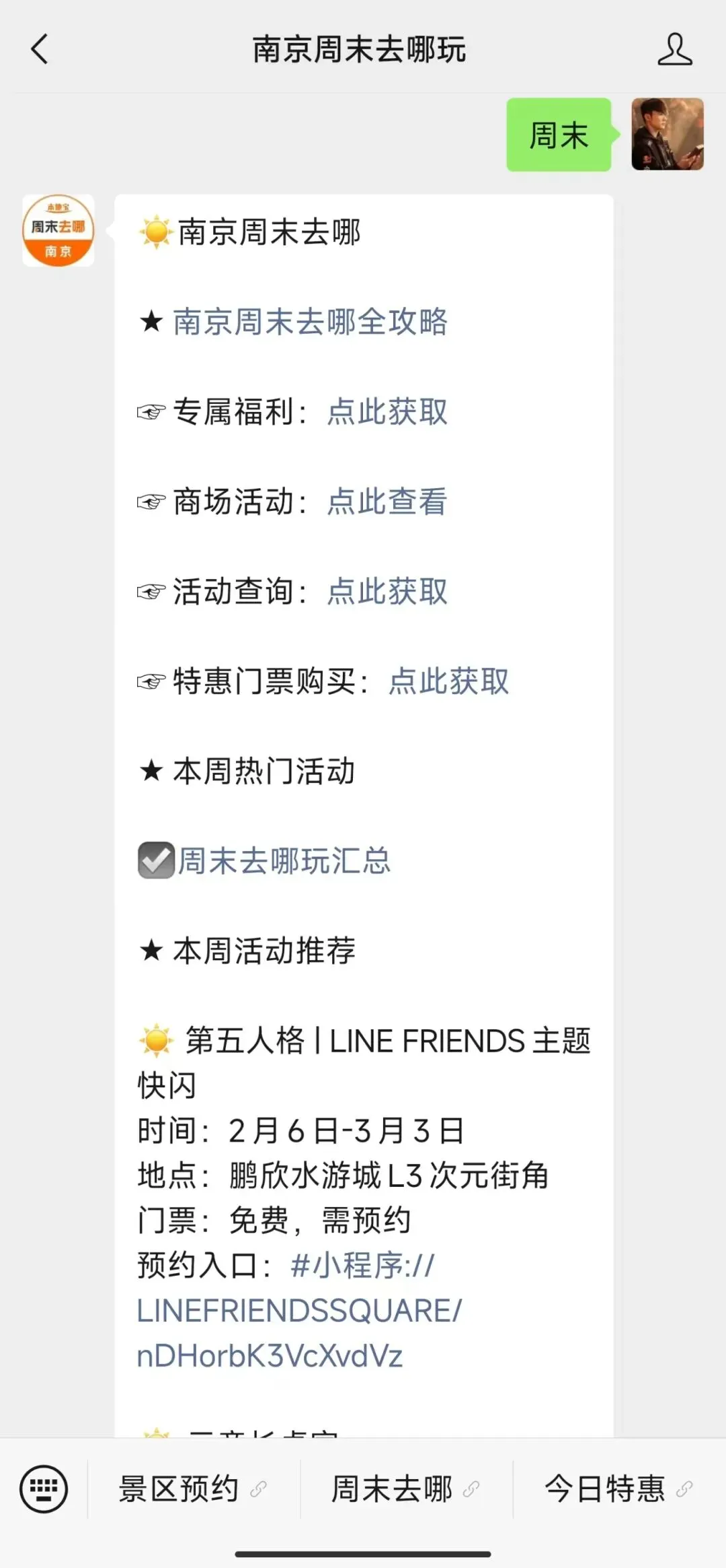 或者关注【南京周末去哪玩】公众号,点击发消息,后台回复【周末】即可获取