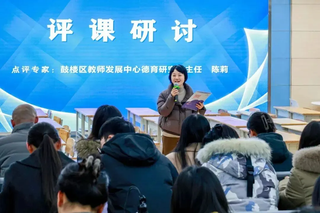 鼓楼区教师发展中心德育研究室主任陈莉对这节班会课进行点评。她认为课程设计环环相扣、逻辑清晰,且创新引入AI技术的形式颇具亮点,既贴合学生认知特点,又强化了情感体验的沉浸感。她还进一步提炼出了班会课的核心亮点,精准契合情感育人的实践导向。同时也给出了针对性的优化建议。