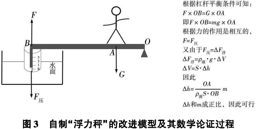 完成测定苹果任务后,教师进一步提出新的需求:利用“浮力秤”原理,来测定一个人的体重,又需要进行哪些改进呢?请画出设计图,并给出说明。学生意识到,这是一个超过量程的问题,同时又不能降低精确度从而否定采用底面积更大的容器。新的认知冲突的出现,正是激发学生深度思考的契机。随着学生讨论的深入,有些学生想到了可以从费力杠杆的角度进行改进,采用带直角形的杠杆,将直角的一端置于容器内,而人站立在离O点较近处,组成费力杠杆。改进模型及其数学证明如下......
