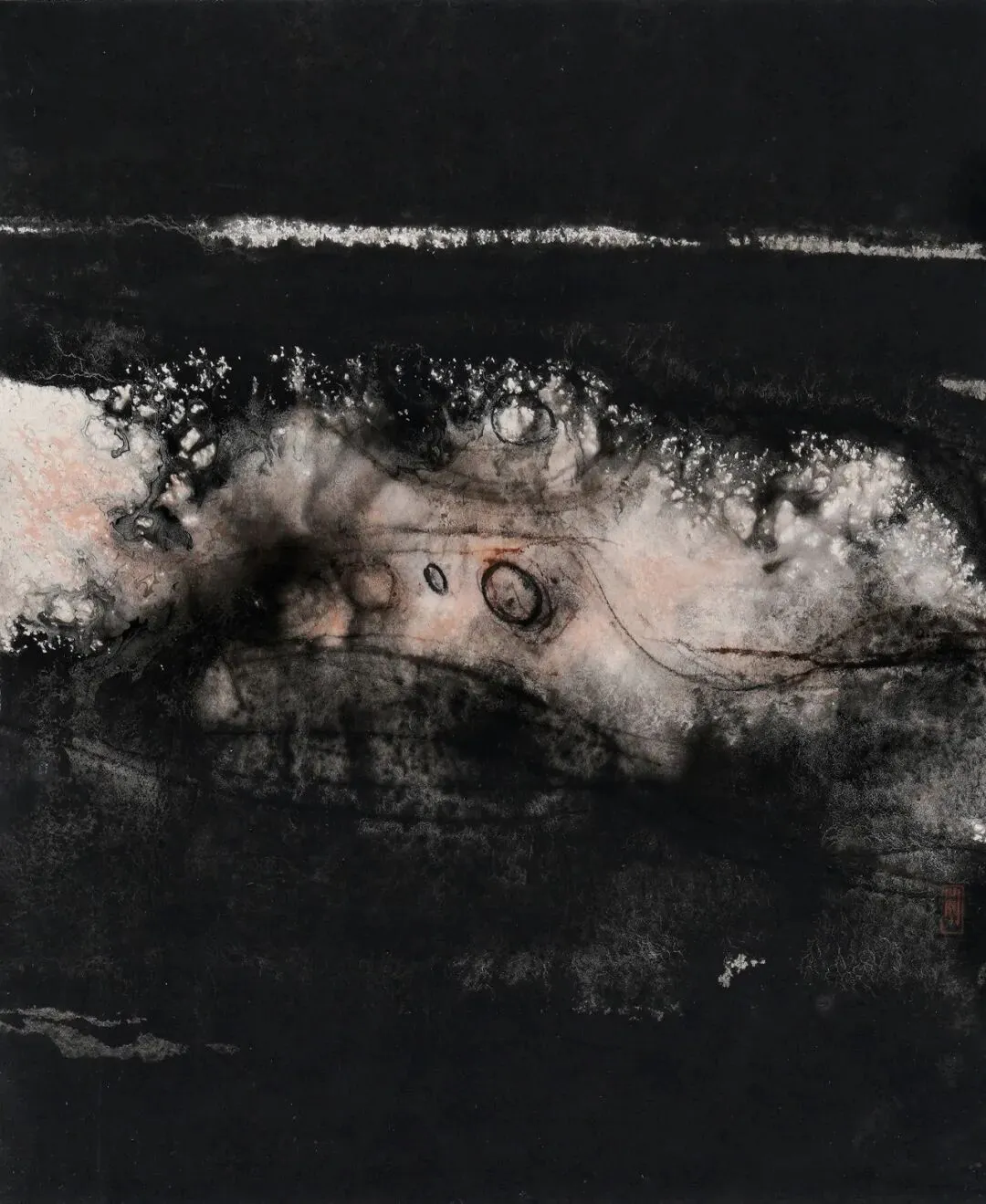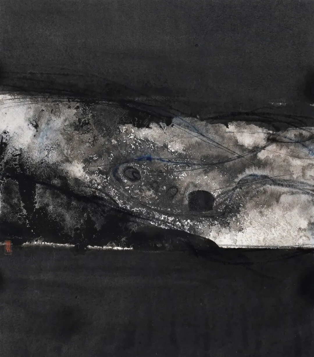 杨键在其创作手记《绝对黑与寂灭黑》中阐释了自己的艺术追求。他坦言自己着迷于画中的“黑”,从苦山水创作开始,便在墨色的层层积叠中探索精神的边界。他笔下的黑,并非单纯的色彩,而是“时间的静止与结晶”,通过苦涩与贫瘠的笔墨修辞,抵达肃穆之境。在极致的黑中,一星微光自然生发,黑与光浑然一体,不分彼此。这种从黑中诞生的光,不是自然光,而是源自内心的精神之光,也让他笔下的莲花超越生死,成为“涅槃之花”。