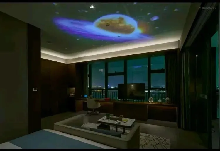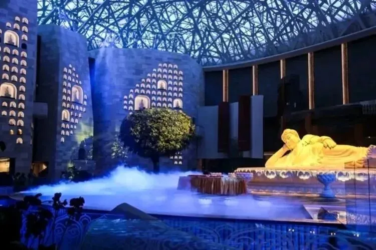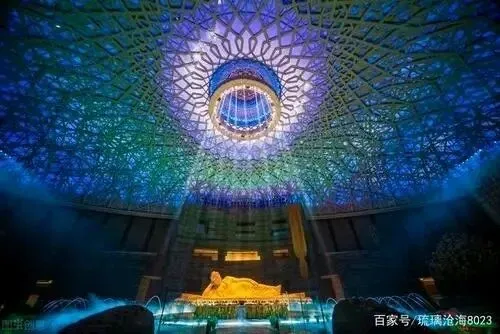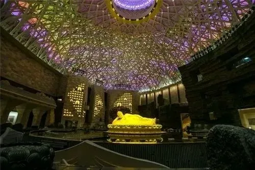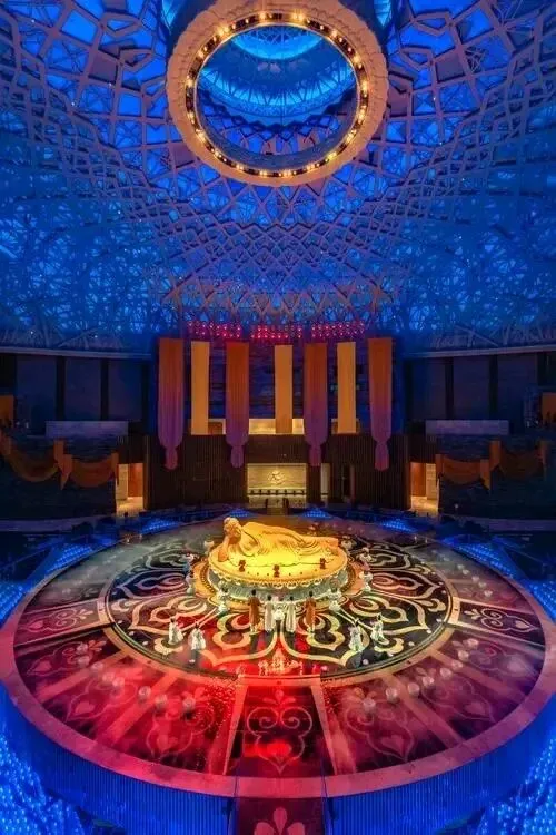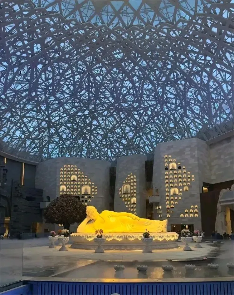 图案来源于佛陀涅槃时的娑罗树杈。穹顶采用了全覆盖的透光膜和灯光,可以营造出清晨的第一缕晨曦、正午热烈的日光、傍晚的彩霞和入夜的月光。