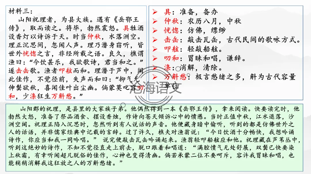 D.山阳祝理在阅读《岳鄂王传》时,为岳飞遭遇感到震怒,在听到渔樵二人的唱和后 受到启发,怒气顿消。