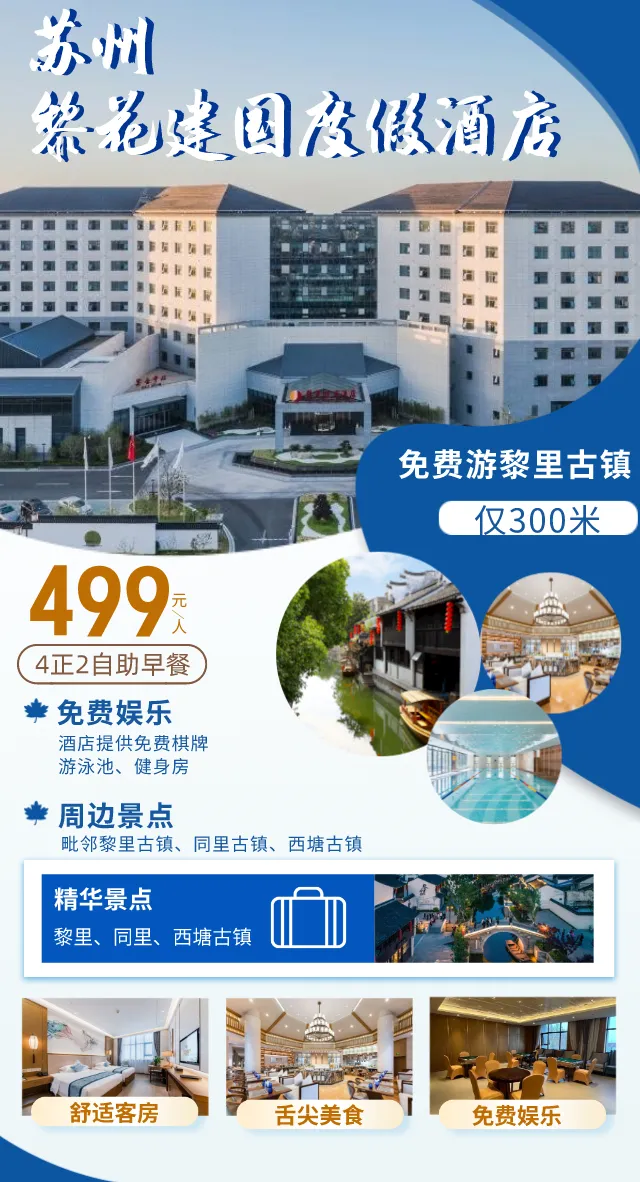 苏州【黎花建国酒店】3天2晚4正2自助早499元,出门步行即达黎里古镇!自助早餐吃到撑,免费棋牌、游泳池