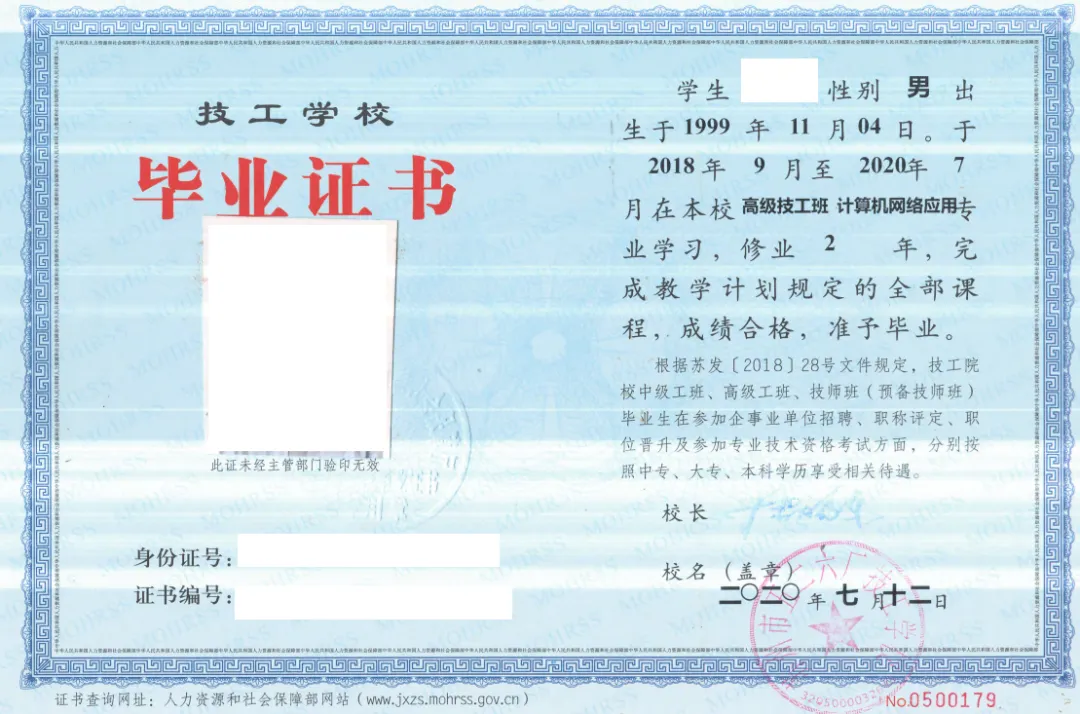 毕业获取证书:信息通讯网络运行管理员中级、技校中级毕业证