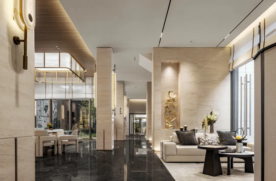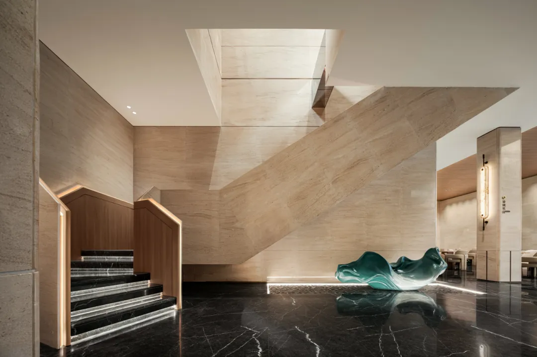 光影的把控更为精妙,隐藏于侧的灯带,将木材的肌理渲染得层次分明,从天井倾泻而下的自然光,在黑色大理石表面流动如太湖涟漪,光影随阶梯起伏如溪流奔涌,让空间成为承载光影艺术的容器。