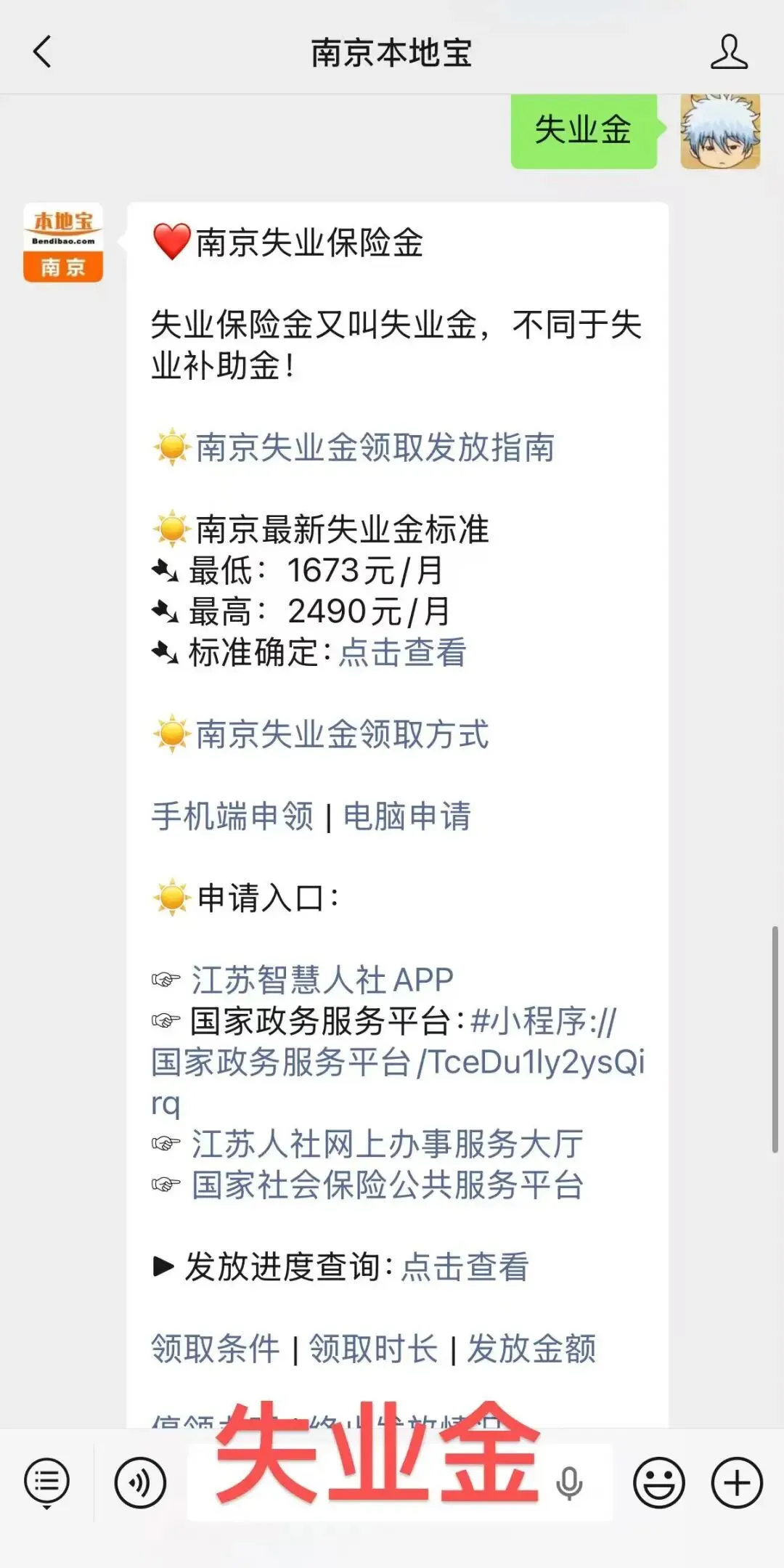 🌞推荐服务:扫描下方二维码,关注【南京本地宝】公众号,回复【失业金】关键词,即可获取南京失业保险线上登记办法、失业金申请平台、申请攻略、线下领取机构等。
