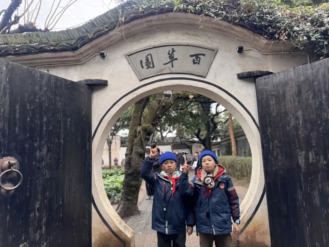 研学首日,小陶子们走进绍兴鲁迅故里,重走《从百草园到三味书屋》路径,触摸石井栏、细数皂荚树、端坐旧书桌,沉浸式感受文坛巨匠笔下的场景。