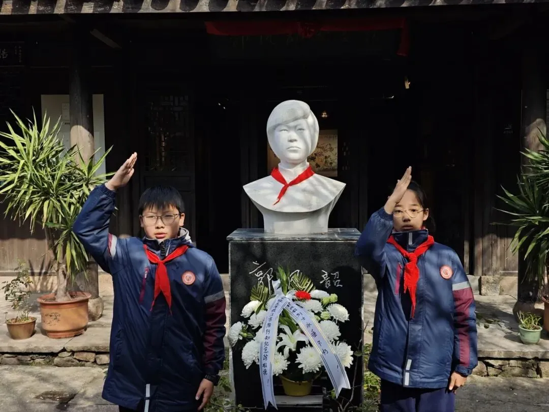 次日,小陶子们走进台州临海郭凤韶烈士故居,参与庄严肃穆的研学纪念仪式。讲解员章冬玲老师讲述烈士从爱国少女成长为革命先锋的壮丽人生,南京晓庄学院陶行知纪念馆馆长何文秋勉励同学们践行 “教学做合一” 使命。全体师生肃立献花、行三鞠躬礼,齐诵《少年中国说》,让红色基因与责任担当在心中扎根。参观展厅时,“新蕾初绽”“傲霜斗雪”等主题展陈,让同学们读懂了19岁烈士短暂却炽热的生命价值,深刻领悟 “千教万教,教人求真;千学万学,学做真人” 的真谛。
