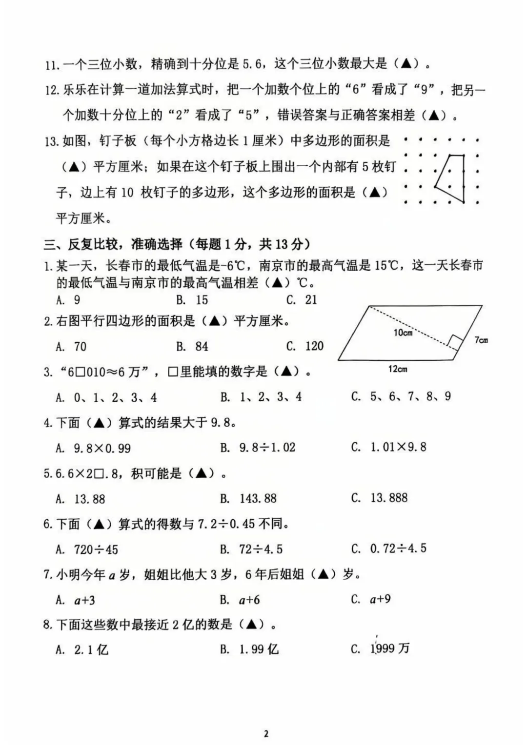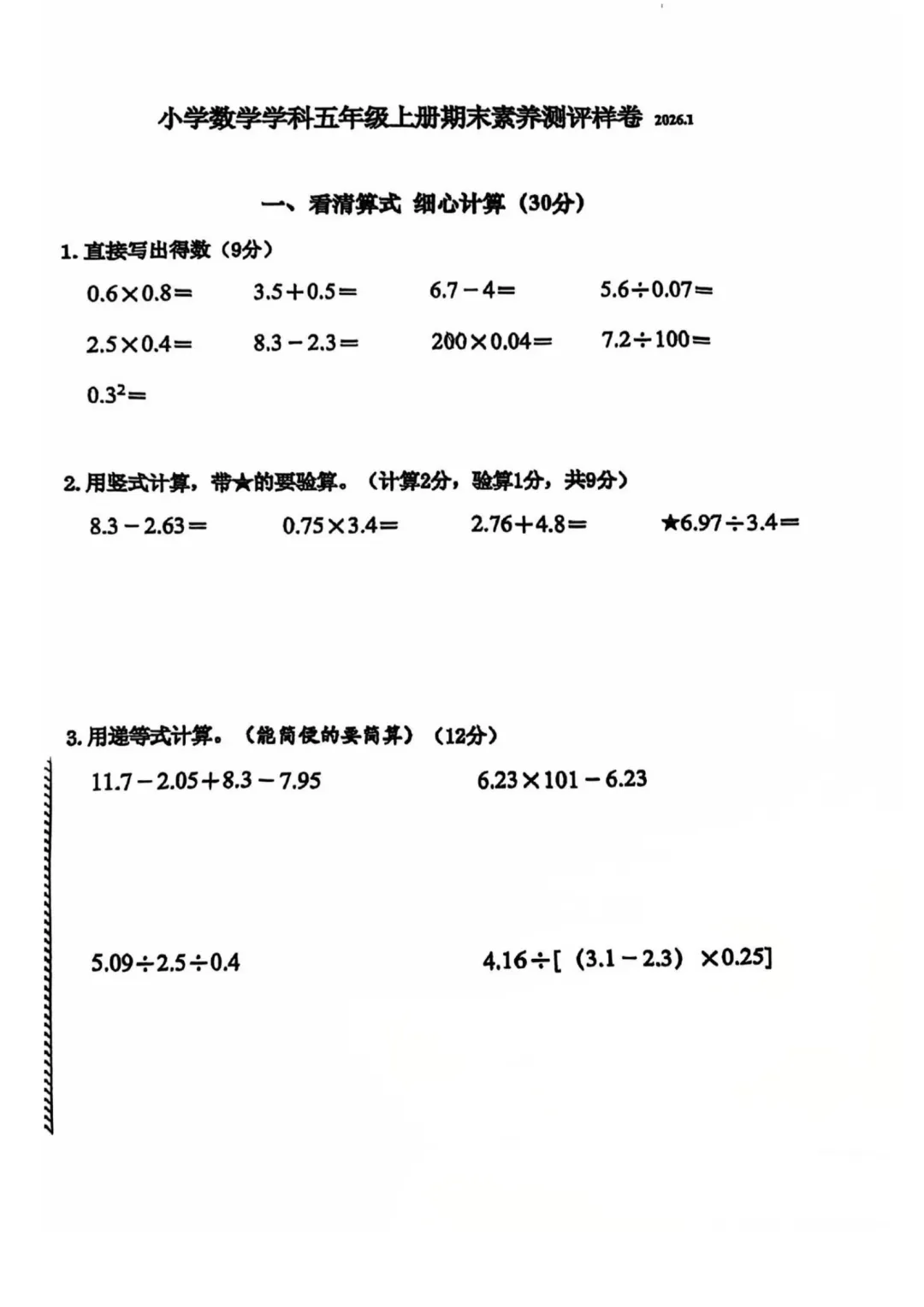 2025-2026南京小学五年级上学期期末数学真题试卷(2026.1)