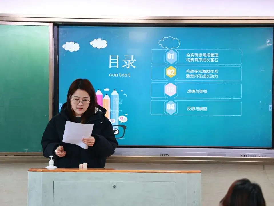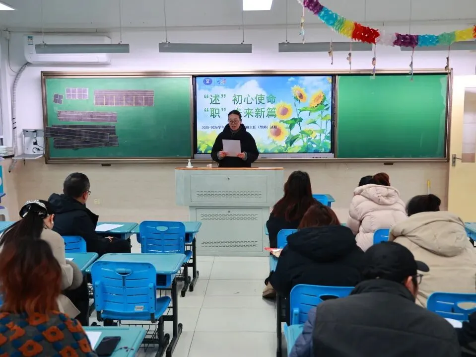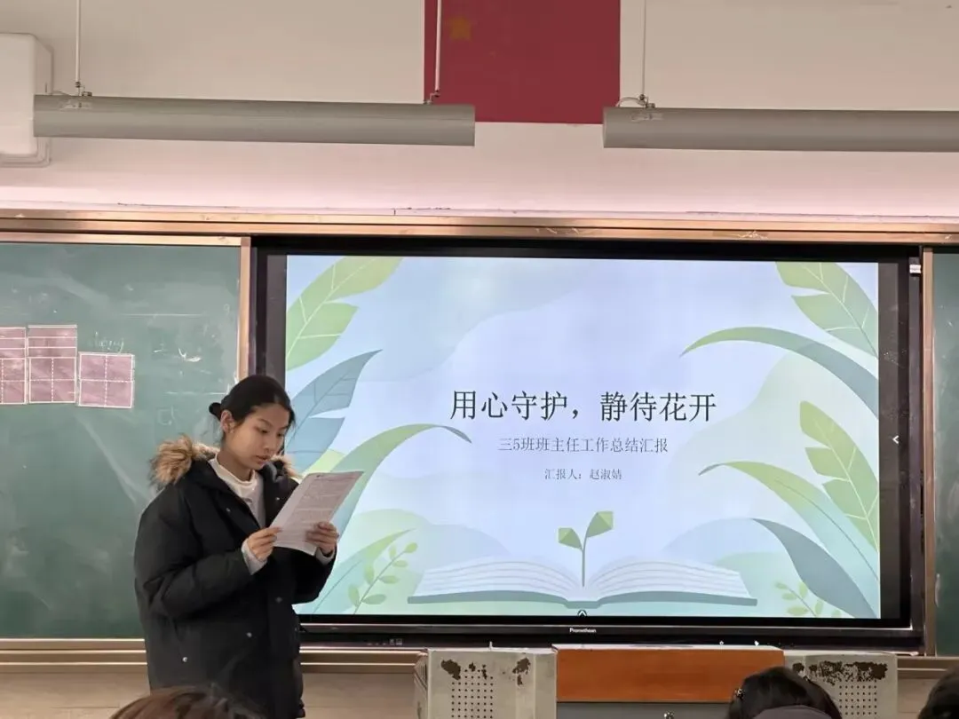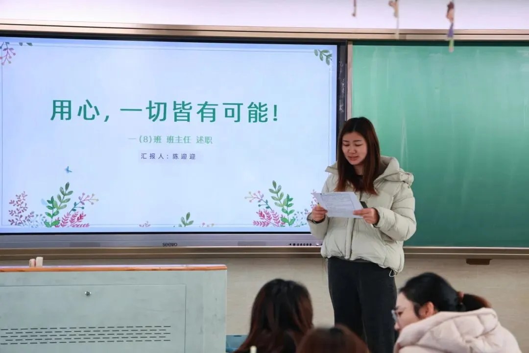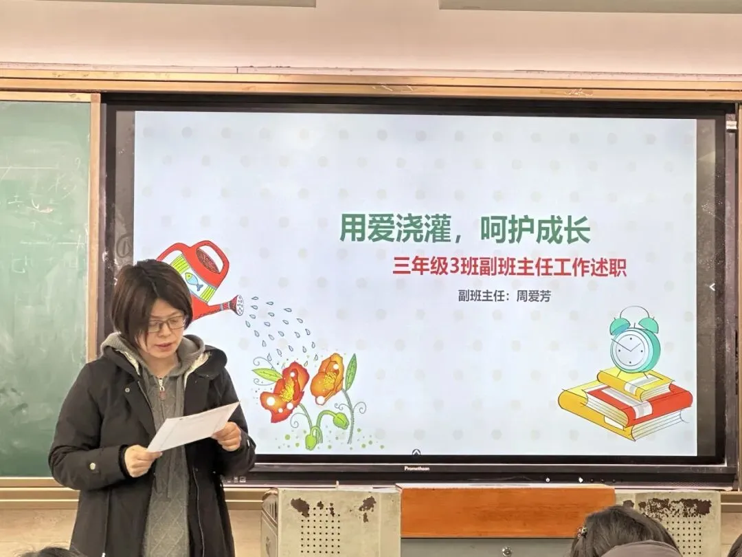 随后,各班正副班主任依次进行述职汇报,成为本次活动的核心环节。正班主任们围绕5分钟述职要求,紧扣班级管理实践,从班风学风营造、学生思想道德教育、特殊学生帮扶、家校共育搭建等方面,分享了一学期来的育人故事与班主任管理工作心得。有的老师聚焦班级自主管理体系构建,通过建立“小干部轮岗制”“积分激励制”,培养学生的责任意识与集体荣誉感;有的老师侧重心灵滋养,用耐心与关爱倾听学生心声,化解成长困惑,成为孩子们的良师益友;有的老师则突出家校协同,通过线上线下多渠道沟通,凝聚教育合力,为学生成长保驾护航。