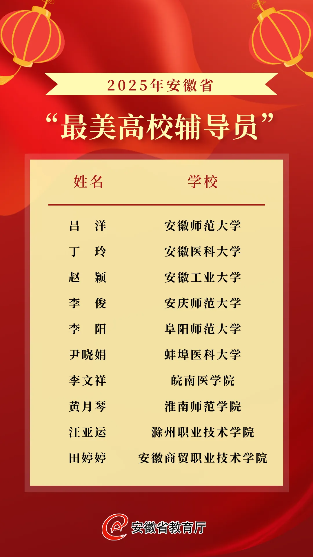 为大力培育和选树新时代师生先进榜样,省委宣传部、省委教育工委联合组织开展2025年安徽省“最美高校辅导员”和“最美大学生”学习宣传活动。经学校申报、专家评审、评委会评议等环节,评选出2025年安徽省“最美高校辅导员”和“最美大学生”各10名。