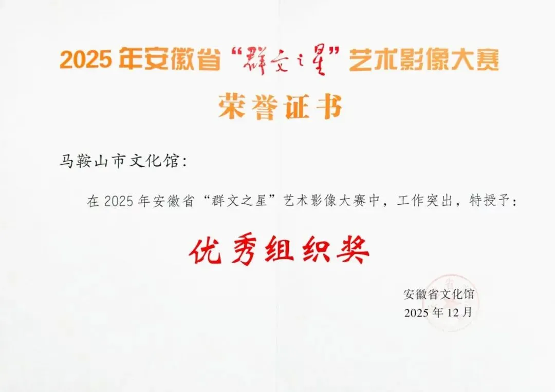 近日,2025年安徽省“群文之星”艺术影像大赛年度评选结果重磅出炉,马鞍山市文化馆选送的5件摄影作品在全省众多参赛作品中崭露头角,成功跻身全省24件年度最佳作品奖项行列,为我市群众文化事业再添亮眼成绩单。马鞍山市文化馆被授予“优秀组织奖”。