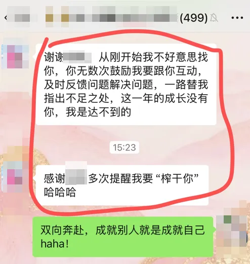这让我想到自己1月份启动的私域电商副业。刚开始完全不懂,但这里有很多姐妹愿意教我,如何引流、如何写朋友圈、如何做社群,甚至我们的大团长也说,“一定要‘榨干’她,因为这是双向奔赴,成就别人,也是成就自己。”这不也算是传承吗?