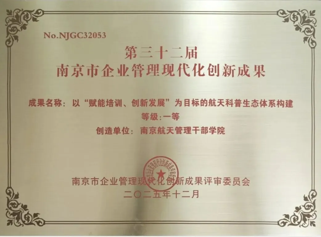 会上,第32届南京市企业管理创新成果正式发布。学院申报的《以“赋能培训、创新发展”为目标的航天科普生态体系构建》管理创新成果,凭借鲜明特色和扎实实践成效,荣获南京市管理创新成果一等奖。学院党委副书记、副院长李勋超受邀参加会议,并代表学院领取奖牌。